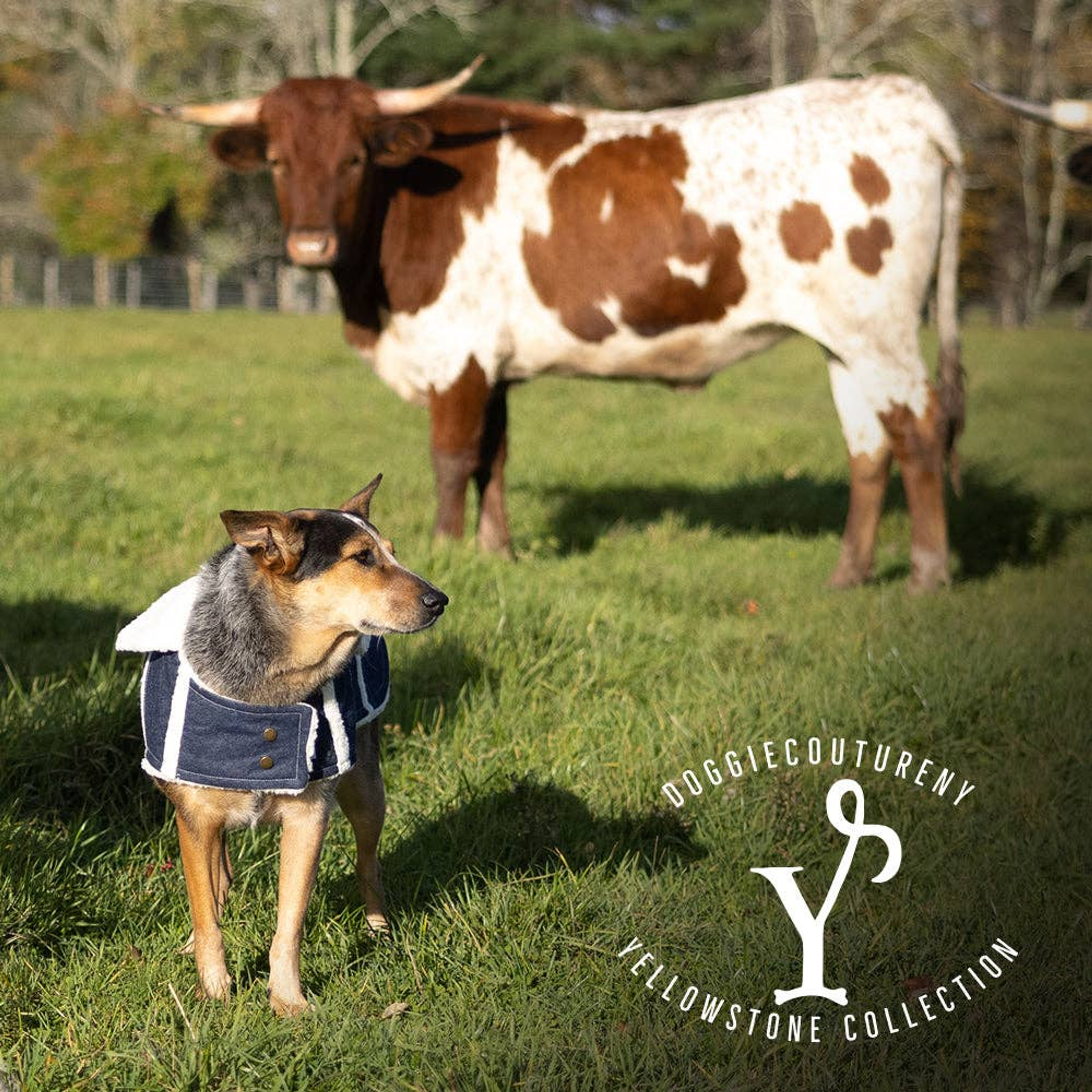 DCNY Ranch Dog Coat features a rich color palette with a Southwestern-inspired geometric print yoke and a dark wash denim body. This stylish coat is a fall season staple. With its silver snap detailing, it offers a chic take on the classic ranch coat. Perfect for pups that embody the gritty Western spirit but also insist on being tucked in every night.
